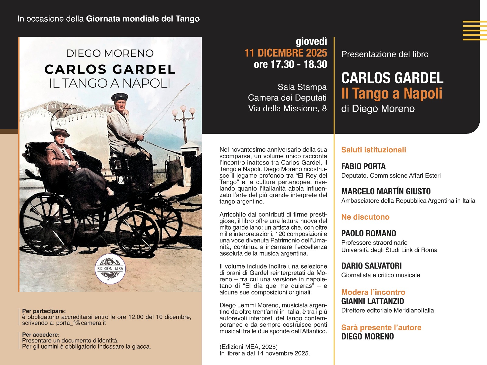 L’on. Fabio Porta, in occasione della Giornata Mondiale del Tango, presenterà il volume “Carlos Gardel. Il Tango a Napoli” di Diego Moreno, in uscita nelle librerie italiane in questi giorni. L’evento si svolgerà giovedì 11 dicembre 2025, dalle ore 17.30 alle 18.30, presso la Sala Stampa della Camera dei Deputati, in Via della Missione 8.
