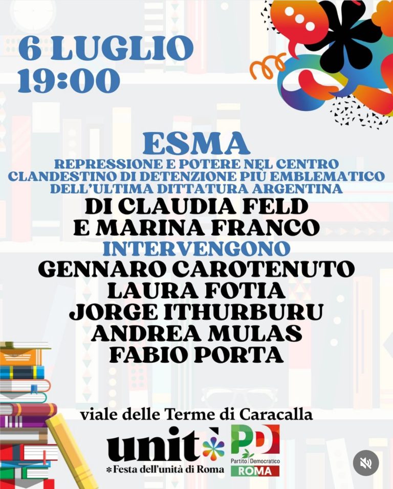 Con motivo de la Fiesta de la Unidad de Roma, el sábado 6 de julio a las 19.00 horas, se celebrará un encuentro histórico y civil en profundidad dedicado al libro: “ESMA. Represión y poder en el centro clandestino de detención más emblemático de la última dictadura argentina”, editado por Claudia Feld y Marina Franco, con prólogo de Carlo Greppi y Andrea Mulas.