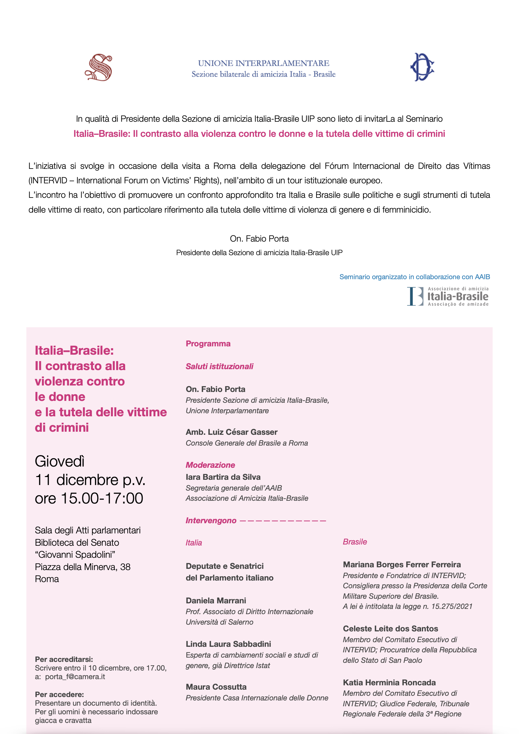 La Sezione di amicizia Italia–Brasile dell’Unione Interparlamentare promuove, il giorno 11 dicembre, dalle 15.00 alle 17.00, presso la Sala degli Atti parlamentari della Biblioteca del Senato “Giovanni Spadolini” (Piazza della Minerva, 38 – Roma), il seminario dal titolo: “Italia–Brasile: Il contrasto alla violenza contro le donne e la tutela delle vittime di crimini”.